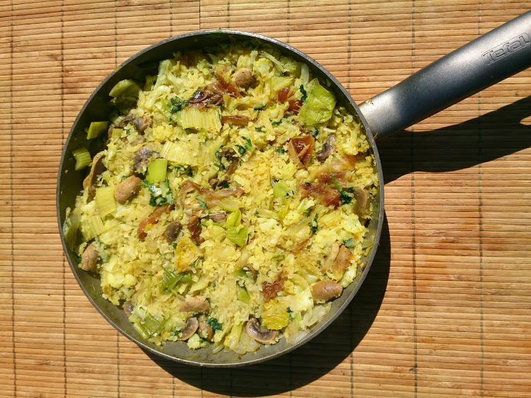 Put the leek and onion to sauté in a skillet. I normally add some coconut oil but that’s optional. When they start to get tender add the mushrooms, celery and a part of the broth. Let it cook under a cover until the broth almost gets soaked up, and then add the grated cauliflower, the spices and the rest of the broth. Cover for some more minutes before adding the coriander, ginger and dates. Leave for another 2-3 minutes before serving.